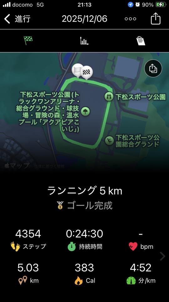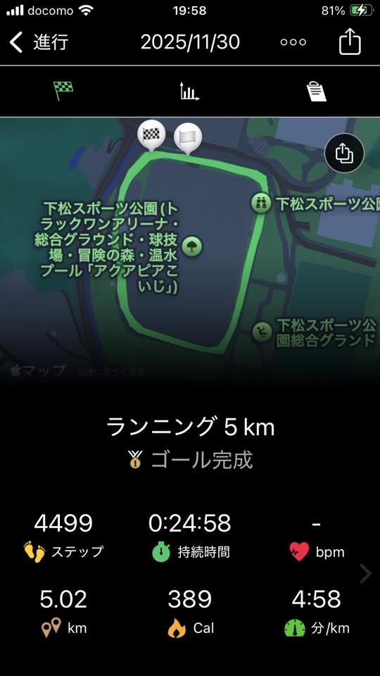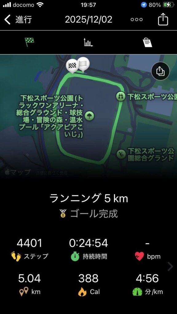 2025年12月8日 / 最終更新日 : 2025年12月8日 humminglife ブログ 1km 4分台 こんばんは、ながゴローです。 一年以上前から始めたランニング、 5kmを目安に毎日走るように心がけてます。 タイムの方も1kmあたりのタイムが5分30秒くらいだったのが、 ぼちぼち5分を切る日も出てくるようになりました。 4分50秒の壁が以外と厚くて、 タイムアップし目指して頑張ります!! 歩数が少ない方がタイムも良いんだなぁなどと思ったりしています。 目標4分30秒切り!!