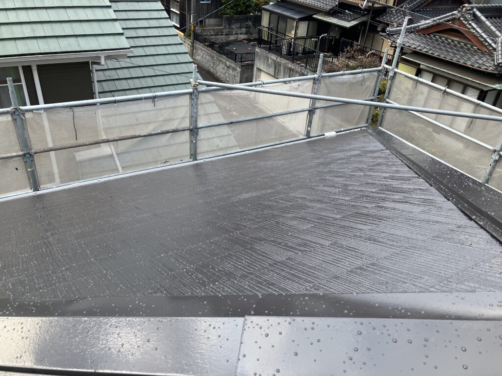 2026年2月16日 / 最終更新日 : 2026年2月16日 humminglife ブログ 光市 K様邸 外壁・屋根塗装③ こんにちは、正ちゃんです! 昨日は暖かかったですが、 今日は若干肌寒いですね。 気温が日替わりなのは困りますね…。 さて、K様邸続きです。 前回屋根の下塗りを塗りましたので、 上塗りを2回塗って仕上げです。 南面です。 西面です。 雨上がりで写真を撮ったので水滴が付いています。 しっかりと仕上げることができています。 続きはまた次回です!