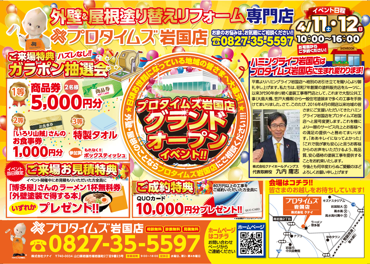 岩国市の皆様へ  岩国市でお世話になり、早10年。この度「ハミングライフ岩国店」は屋号を変更し、「プロタイムズ岩国店」として新たにスタートいたします。これまで支えていただいた地域の皆様へ、感謝の気持ちを込めてイベントを開催いたします。ささやかではございますが、ご来場いただいた皆様にはスタッフ一同、精一杯のおもてなしをさせていただきます。ぜひお気軽にお立ち寄りください。皆様のご来場を心よりお待ちしております。