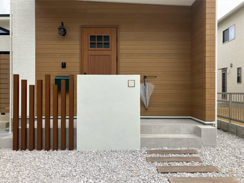 その横に木目調のアルミ柱をランダムに建てています。